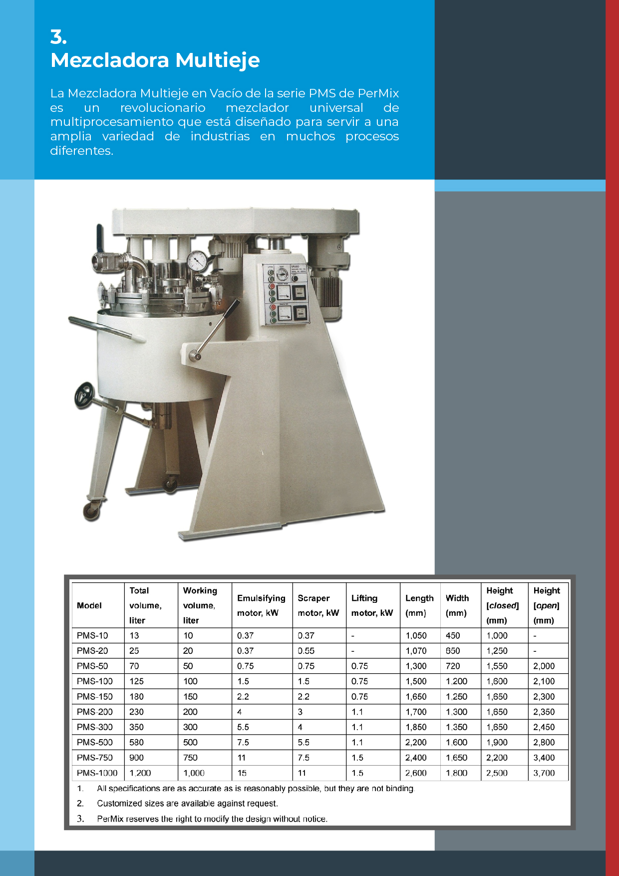 El mezclador de multi-eje de la serie PerMix PMS sirve una amplia variedad de industrias, como la farmacéutica y la industria cosmética para la producción de emulsiones, pomadas, lociones, pastas, cremas, delineadores de ojos, maquillaje, champú, crema de afeitar, pasta de dientes, etc, la industria de alimentos para la producción de salsa de tomate, mayonesa, aderezos para ensaladas, queso crema, varios concentrados, etc, y la industria química para la producción de betunes para zapatos, compuestos sellantes, limpiadores de automóviles, suspensiones, etc. El homogeneizador de vacío de la serie PerMix PVH realiza las mismas funciones para aplicaciones de la industria alimentaria.